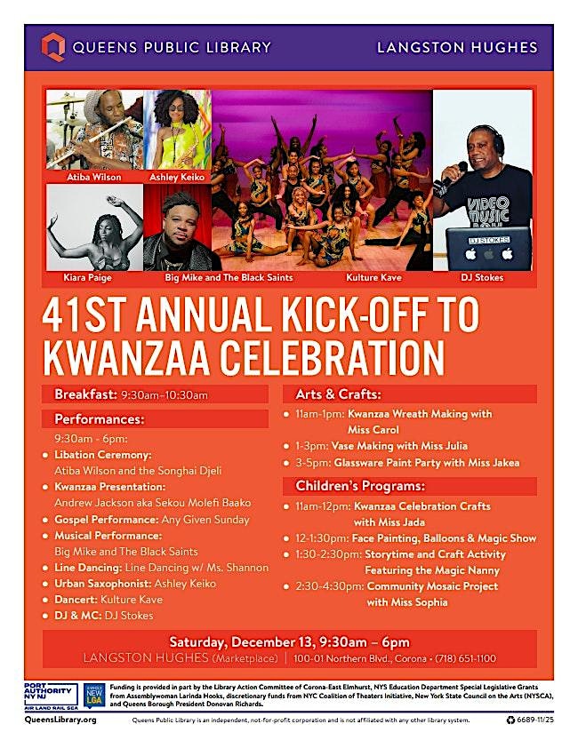 Join the Langston Hughes Community Library and Cultural Center for the 41st Annual Kick-Off to Kwanzaa Celebration—a full day of culture, creativity, and community spirit! Taking place on Saturday, December 13, from 9:30am to 6pm, this vibrant celebration welcomes families and community members of all ages to honor the traditions and principles of Kwanzaa through art, music, learning, and togetherness.