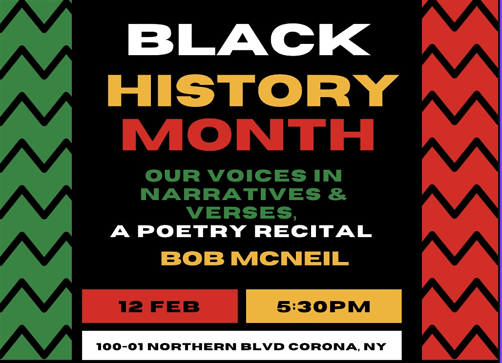 Join us at the Langston Hughes Library for a recital by acclaimed poet, essayist, and artist Bob McNeil. Join us as Mr. McNeil pays tribute to the following literary milestones through recital and discussion: the Harlem Renaissance (1910s–1930s), the Chicago Renaissance (1930s–1950s), the Civil Rights/Black Protest Literature (1940s–1960s), the Black Arts Movement (1965–1975), the Afrofuturism wave (1980s–present), and the Contemporary Black Literary Renaissance (1990s–present).